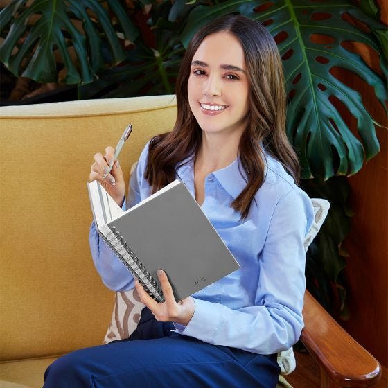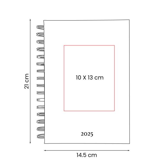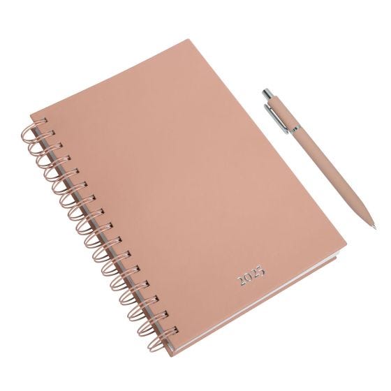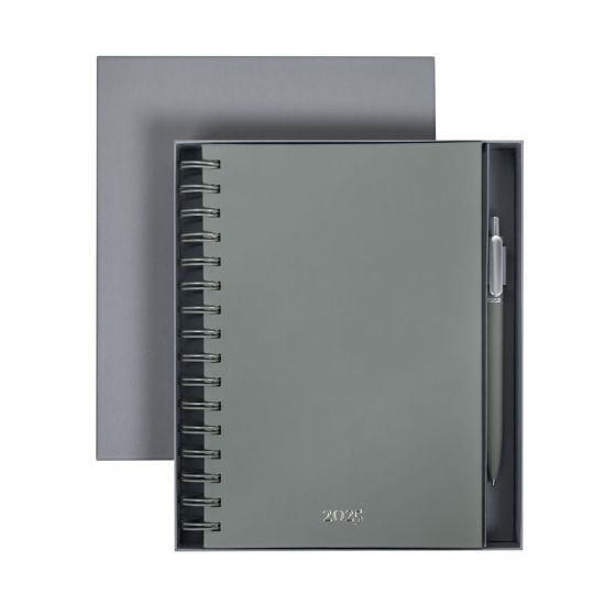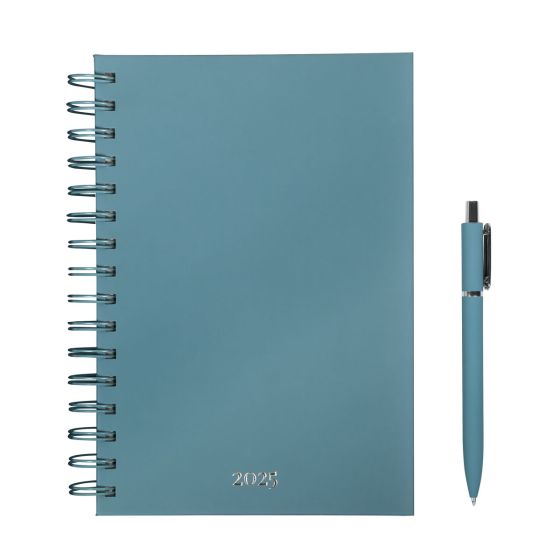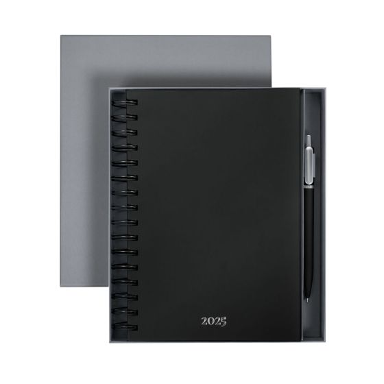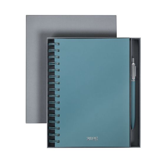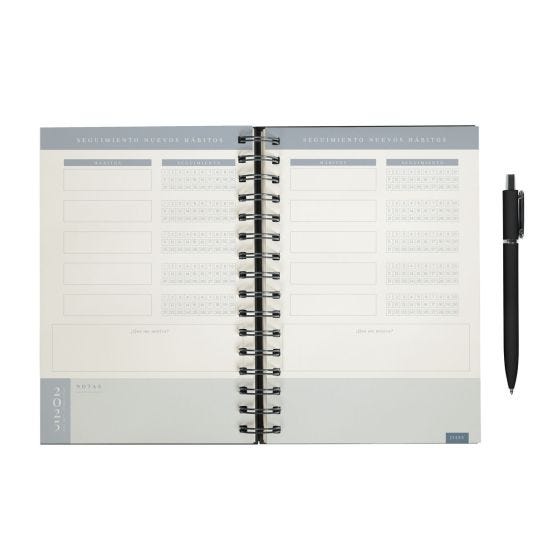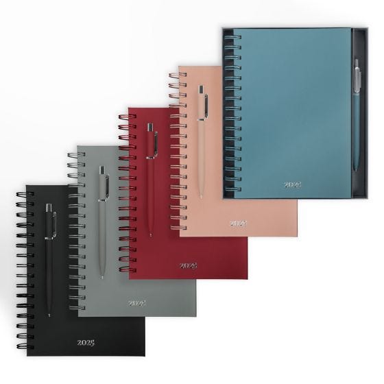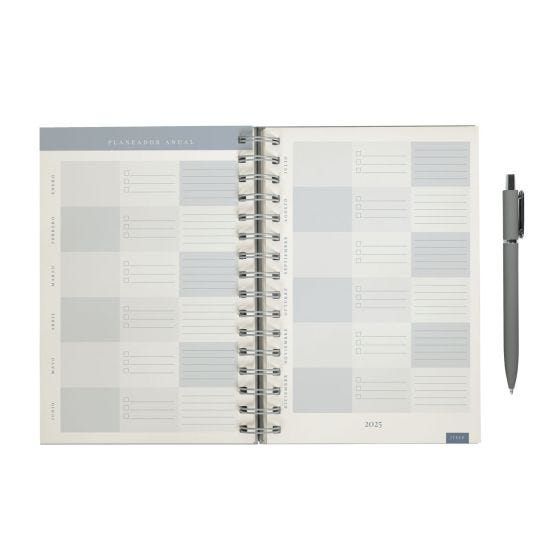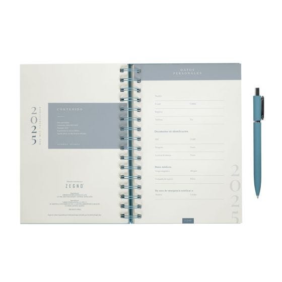 Agenda diaria con 174 hojas. Contiene datos personales, calendarios 2024-2025-2026, planeador 2025, seguimiento de nuevos hábitos y días festivos. Incluye bolígrafo metálico y caja individual tipo regalo.