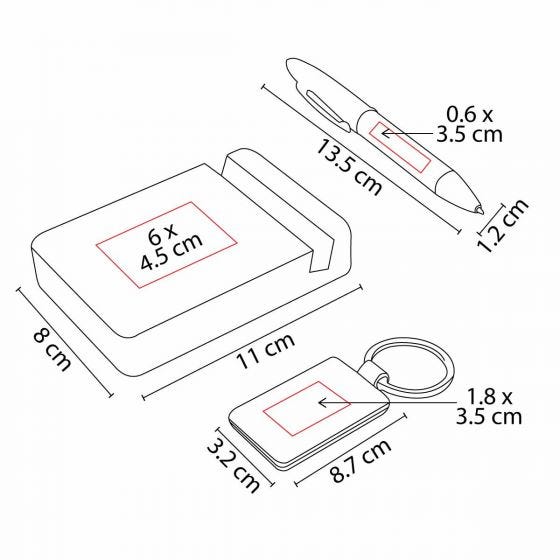 | Área | 4.5 x 6 cm Base / 1.8 x 3.5 cm Llavero / 0.6 x 3.5 cm Bolígrafo |
